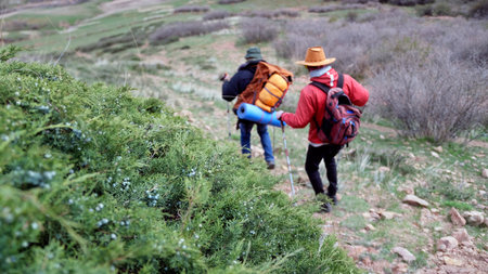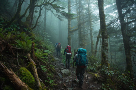 A group of diverse individuals is seen hiking up a rugged trail in a mountainous area. The hikers are dressed in outdoor gear and are carrying backpacks. They are actively trekking forward, surrounded by lush greenery and rocky terrain.