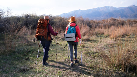 Two travelers in bright clothes are engaged in hiking. The sisters walk across the expanses of their country with backpacks and trekking poles. Active weekends. beautiful nature