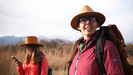 A happy traveler is smiling in the field. A beautiful young woman with glasses, a hat and a backpack is trekking with her girlfriend.