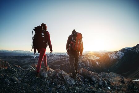 Two hikers male and female walks in sunset mountains