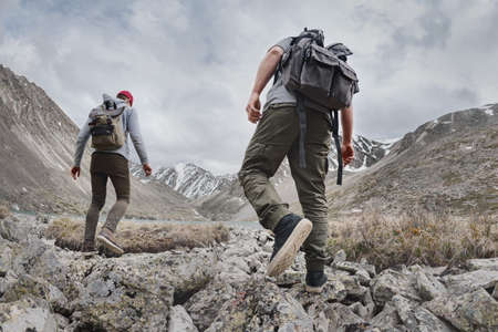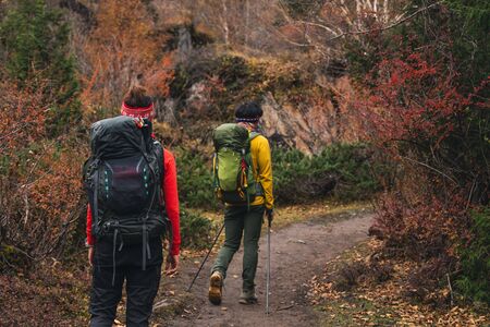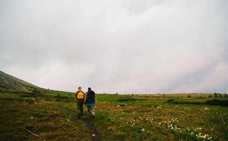 Two young hikers or tourists with small backpacks walks in mountains. Active tourism concept
