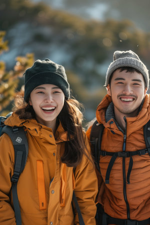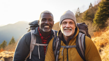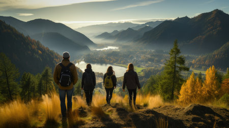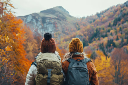 Happy people enjoying cozy mountain tours in autumn, surrounded by colorful foliage.