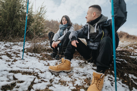 Young hikers resting during a winter hike in a snowy nature setting
