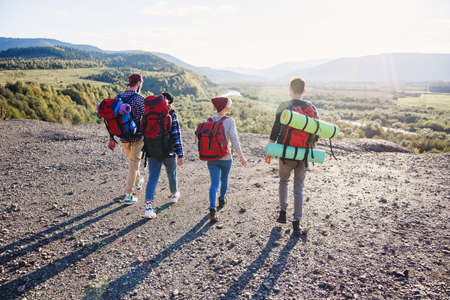 Adventure and hiking. Group of young people make a hike in mountains. Active lifestyle. Tourist equipment.