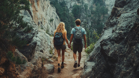 Back view of young couple with backpacks hiking in mountains. Man and woman hiking together.