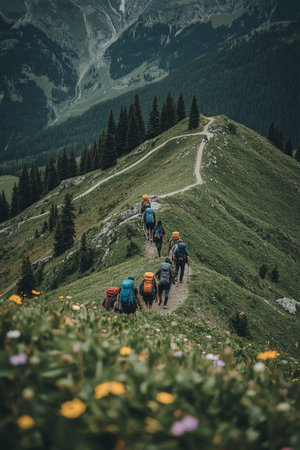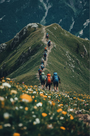 Four hikers with backpacks and trekking poles walk along a narrow dirt path on a lush mountain slope. Surrounded by wildflowers and rock formations, the scene captures outdoor adventure.