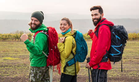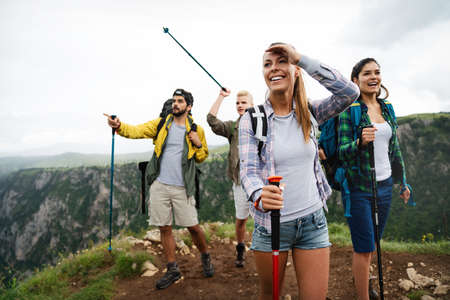 Group of happy hiker friends trekking as part of healthy lifestyle outdoors activity