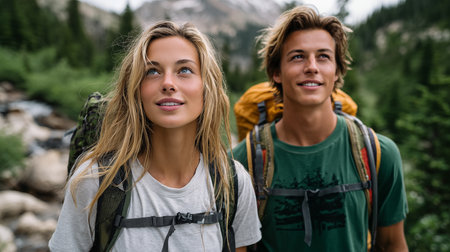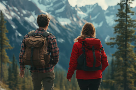 couple with backpacks are seen standing in front of a breathtaking mountain range. The image captures the beauty and awe-inspiring grandeur of nature, as well as the sense of adventure and exploration that comes with hiking and backpacking in the mountains. Generative AI