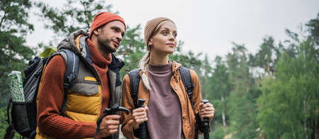 couple with backpacks holding hiking sticks and looking away in forest, banner