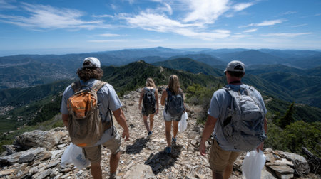 Four hikers walk down a rocky mountain path, carrying bags as they collect litter. The sunny day highlights the beautiful landscape, showing their commitment to preserving nature.