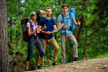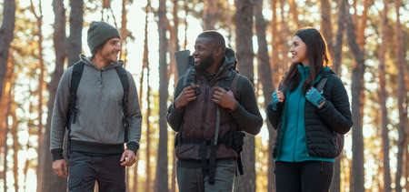 International team two guys and girl talking while hiking by forest, panorama