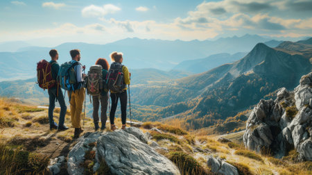 A group of friends on a hiking adventure, panoramic mountain views, capturing the spirit of friendship and exploration. Resplendent.