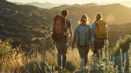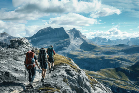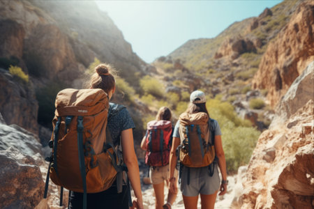 A group of young people hiking through a majestic mountain range, with backpacks, camping gear and water bottles. Concept of adventure and exploration. Generative AI