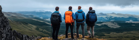 A group of mountaineer friends watching the view from a hill. Generative AI