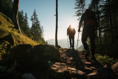 Group of climbers in the rays of the sun in the concept of active extreme sports on the mountain. Hiking climbing adventure travel. AI generated.