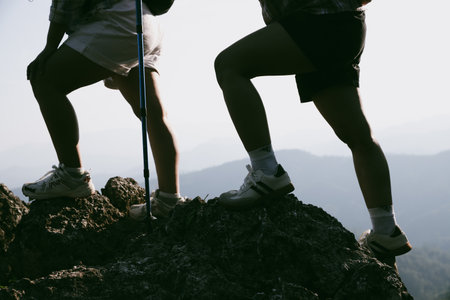 Hiking boot. Close up of female legs in boots on hiking trail on top of mountain outdoor. young woman reaching top of mountain. women feet wearing hiking boots on rock. Travel, vacation concept.