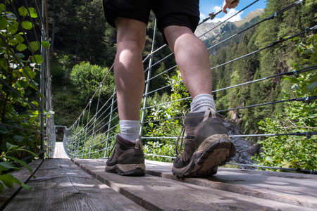 one person young man walking on a wooden suspension bridge in Switzerland, hiking in a forest
