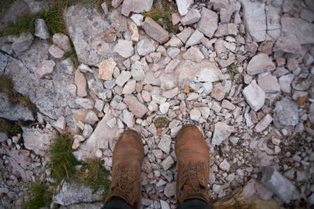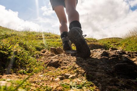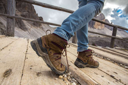 hiking boots close-up. tourist walking on the trail. Italy