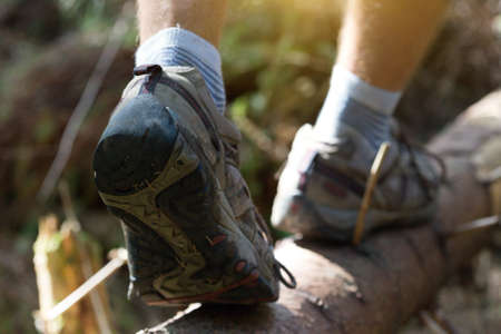 hiking boots close-up. boy tourist steps on a log
