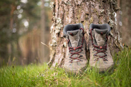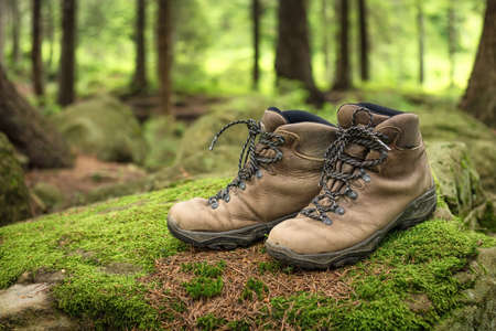 Hiking boots in the forest. Rest after a long trekking walk. Healthy lifestyle in nature.