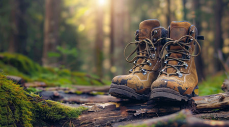 Two brown hiking boots on a log in the woods. Nature and world exploration and active lifestyle.