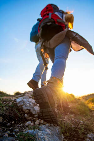 Hikers Legs on the Rocky Trail at Summer Sunset. Travel and Adventure Concept.