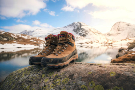 Hiking boots on a rock by a mountain lake