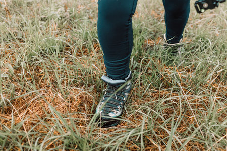 Hiking outdoors. Close-up of a girls legs in hiking shoes in nature. Active recreation in nature. Travel on foot