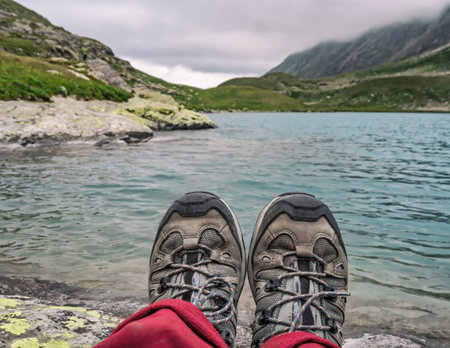 hiking boots close-up against the mountain lake synevyr. Carpathians, Ukraine.