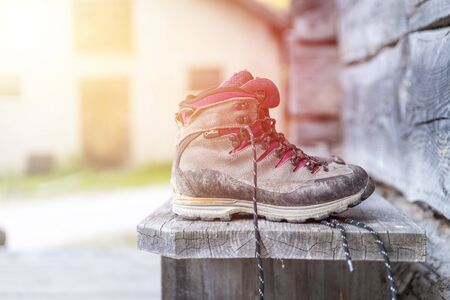 Close up picture of hiking boots on a rustic wooden veranda of an alpine hut