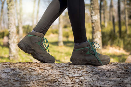 hiking boots close-up. girl tourist steps on a log. active lifestyle