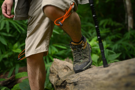 traveler tourist Close up leg of young hipster man one person hiker shoe boots hiking. tourist hikers in adventure forest step trail walking stepping going up the stairs with sunshine. travel concept