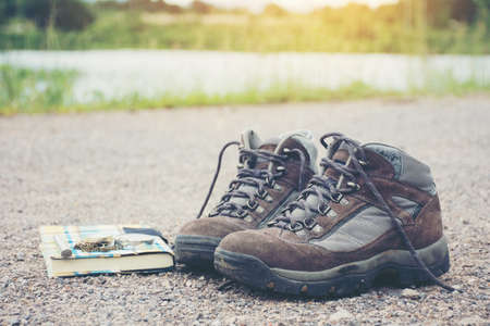 Tourist shoes as a background. Active life concept