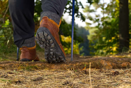 Terrain shoes during trecking in the autumn forest