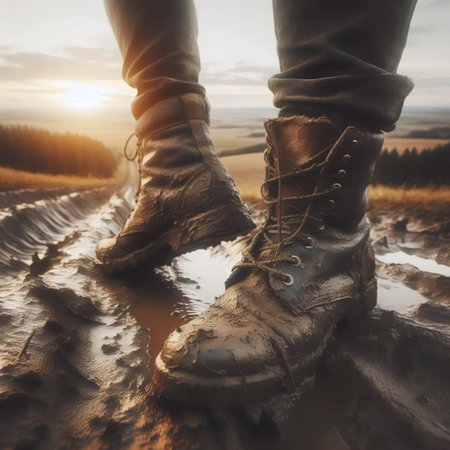 Mud covered hiking boots and sole outdoors. Daytime, no people, close up shot.