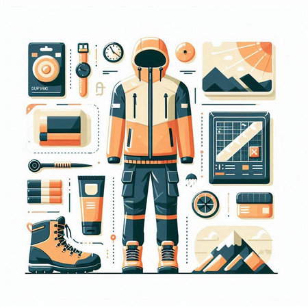 Vector illustration with man in sportswear and equipment for mountaineering.