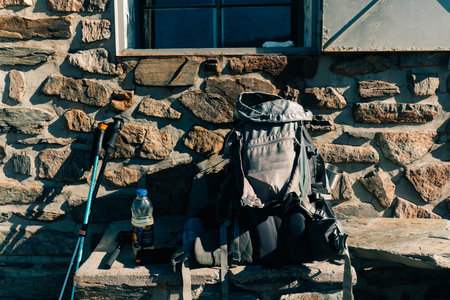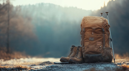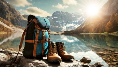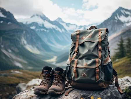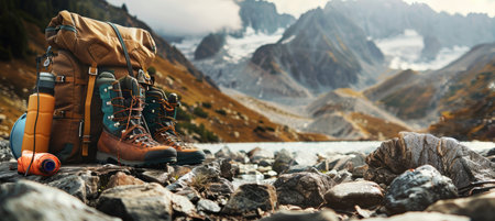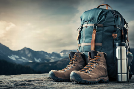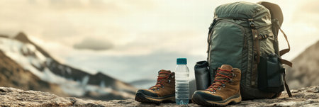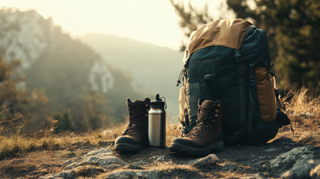 Hiking backpack, durable boots, and a water bottle are ready for an outdoor adventure in a breathtaking mountain landscape.
