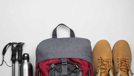 Set of sport equipment and gear for hiking and trekking flat lay on white background with copy space, perfect for outdoor adventure themes, camping projects, travel lifestyle, sports design concepts.