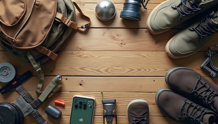 Various hiking items including a brown backpack, olive boots, and other outdoor gear arranged on a rustic wooden surface creating a sense of adventure for outdoor lifestyle marketing.