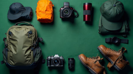 Flat lay of hiking and camping essentials on dark green background. Includes boots, backpack, compass, cameras and travel mug. Items for outdoor adventures. Hobby banner with copy space on right side