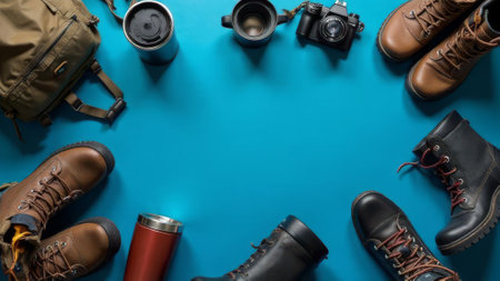 Modern and vintage camera gear, hiking boots, and accessories arranged flat on blue background. Setup for travelers, explorers, or bloggers. Travel and camping banner with copy space