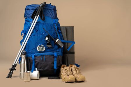 Trekking shoes and hiking equipment with map, backpack, first aid kit and compass