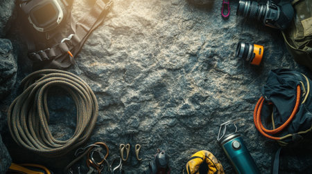 Climbing equipment such as ropes, harnesses, and cameras are organized on a rocky surface, ready for an exciting outdoor adventure in bright daylight