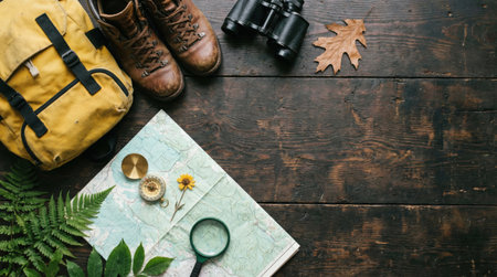 Overhead shot of travel gear, including a backpack, hiking boots, map, binoculars, compass, and leaf, arranged on a rustic wooden surface, perfect for outdoor adventures.