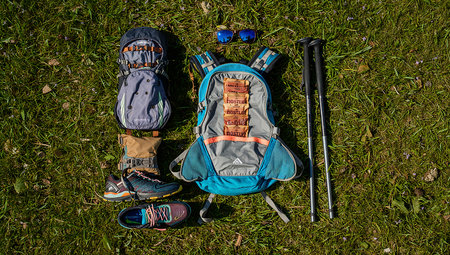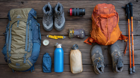 A collection of essential hiking gear, including backpacks, boots, water bottles, and trekking poles, neatly arranged on a rustic wooden background.
