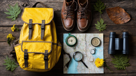 Overhead view of a yellow backpack, hiking boots, map, compass, magnifying glass, and binoculars arranged on a rustic wooden background, suggesting adventure and exploration.