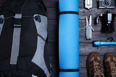 Equipment for trekking and travel on wooden with copy space. Top view.