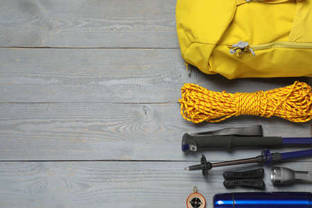 Flat lay composition with tourist backpack and other camping equipment on wooden background, space for text