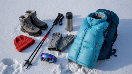 Winter hiking gear with boots poles sleeping bag and accessories on snow
