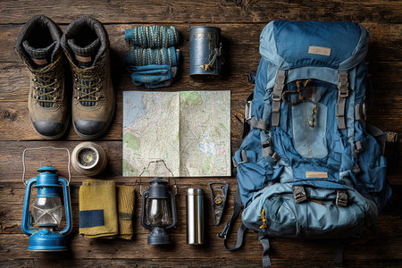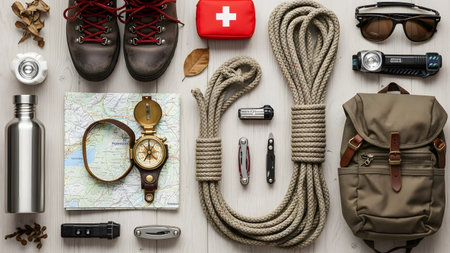 Outdoor adventure essentials spread out on a map with sturdy boots, a backpack, and a safety checklist prepared for a journey in nature.